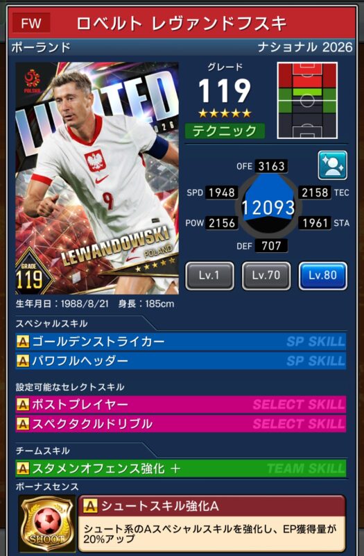 Lv1:EP50%、シュートスキル強化A