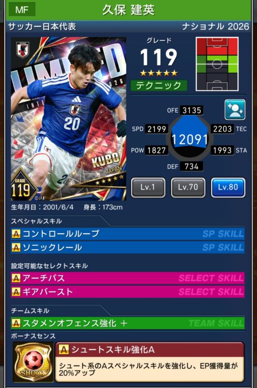 Lv1:EP50%、シュートスキル強化A